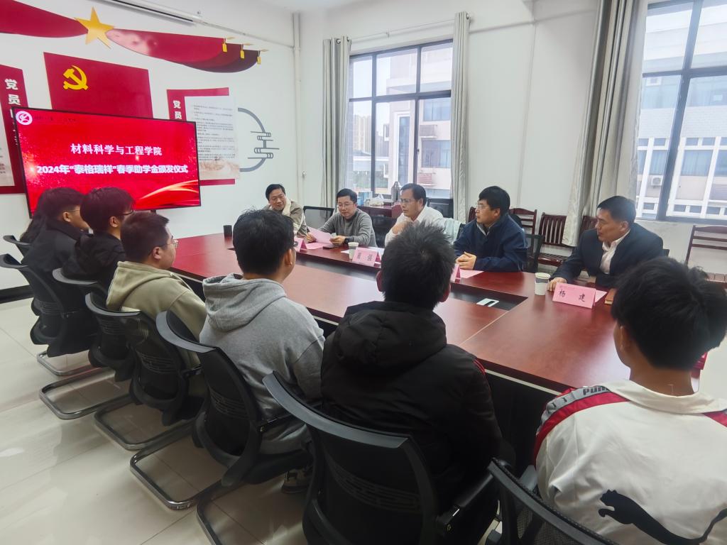 材料南楼405会议室暖意融融,2024年泰格瑞祥春季助学金颁发仪式在这里举行。2002届金相专业校友、天津泰格瑞祥仪器设备有限公司总经理董强,校友处处长孙晓斌,学院党委书记杨建,学院党委副书记、副院长汪盛颜,受助学生及相关年级辅导员参加仪式。仪式由汪盛颜主持。