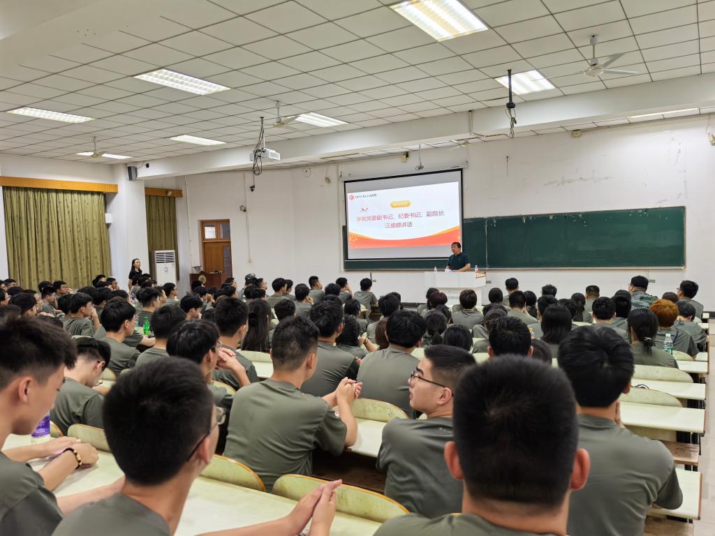 汪盛颜作军训动员讲话。他指出,军训是学院深入贯彻习近平新时代中国特色社会主义思想和习近平强军思想的重要举措,也是学院落实立德树人根本任务,践行为党育人、为国育才初心使命的具体要求。希望2024级新生严格要求自己,以饱满的热情、拼搏的精神和顽强的意志,让军训成为脱胎换骨的“必修课”、爱党爱国的“再教育”,把爱国情、强国志、报国行自觉融入社会主义现代化强国建设中,彰显新时代青年能担大任、能干大事的责任与担当。他向同学们提出三点要求:要发扬不怕苦、不怕累的艰苦奋斗精神;要学会关心集体、关爱他人,增强集体荣誉感;要认真总结,深化心灵的精神力量,从军训中吸取人生智慧,铺就人生底色,最终实现自己人生的宏伟目标。他还向同学们强调了军训时间安排、考核要求、日常管理规定和纪律等。