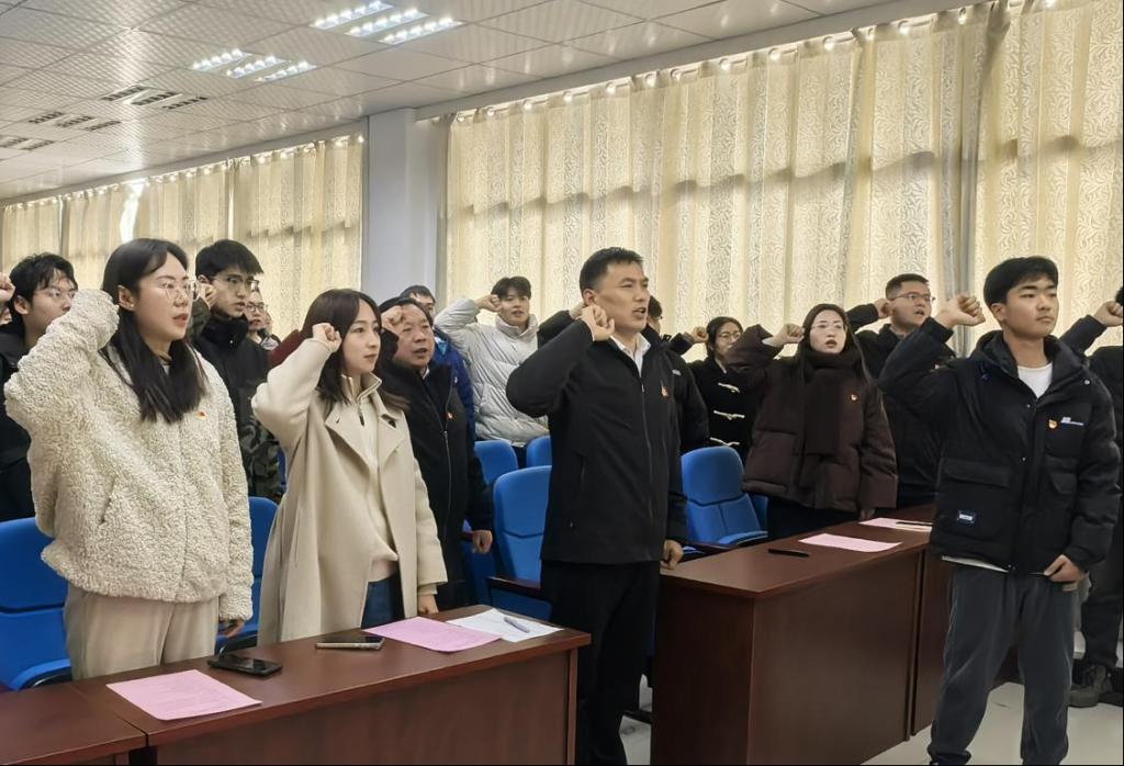 全体党员整装肃立,在本科生金属党支部魏家树同志的带领下,新党员进行入党宣誓,老党员重温入党誓词,铿锵有力的誓言表达了他们为党的事业不懈奋斗、终身奉献的坚定决心。