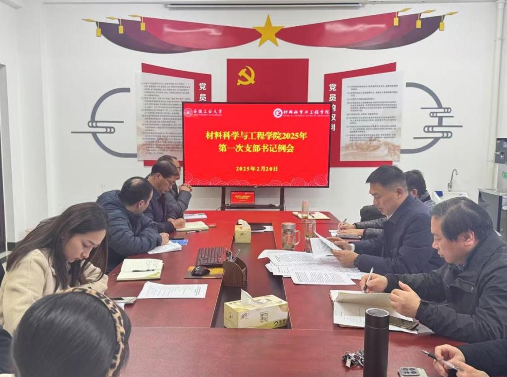 在材料南楼405会议室召开了2025年第一次党支部书记工作例会。会议由学院党委书记杨建主持,院党委副书记、院长柳东明,院党委副书记、纪委书记、副院长汪盛颜、副处级组织员郭道江和全体党支部书记出席了会议。