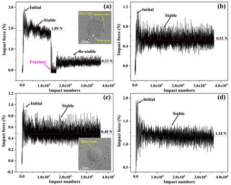 (不同多层结构AlTiN/AlTiBN多层复合涂层的高频冲击力变化曲线 a 单层,b 3层,c 5层,d 10层)