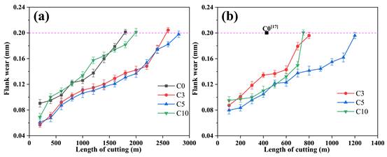 (不同多层结构AlTiN/AlTiBN多层复合涂层刀具的高速干式切削加工钛合金寿命曲线a 80m/min,b 100m/min)
