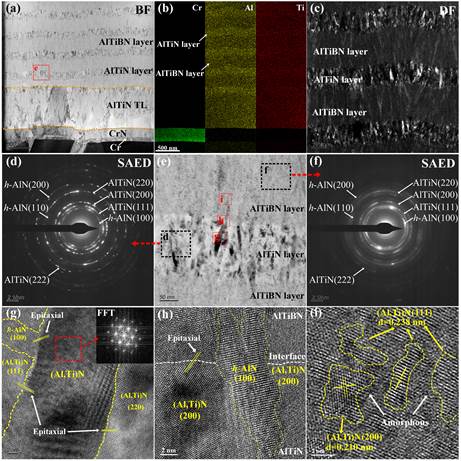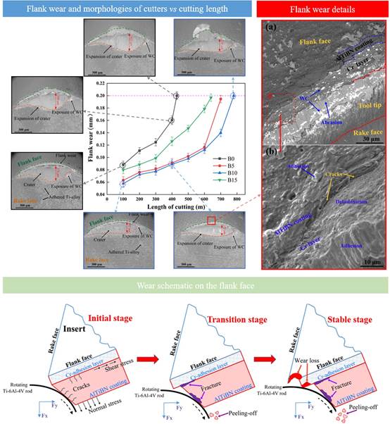 在上述研究基础上,团队针对高速干式切削钛加工合金过程中刀具涂层受到高频冲击导致的疲劳问题,将异质界面共格强化、纳米晶强化、纳米多层增韧协同作用引入了涂层设计,实现了高强韧耐热的AlTiN/AlTiBN多层复合涂层的可控制备,提升了硬质涂层的冲击疲劳抗性和高温性能,进而显著延长了涂层刀具在高速干式切削加工钛合金环境下的服役寿命,并提出通过抑制裂纹扩展来研究涂层切削过程中的磨损、变形、剥落的方法,为制备高性能刀具涂层以及切削磨损失效机理分析提供了新思路。