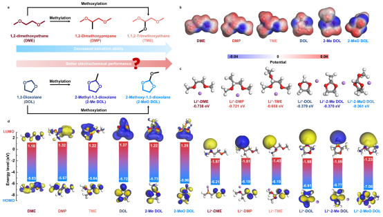 弱溶剂化电解液能通过降低溶剂的溶剂化能力而展现出的优异循环稳定性,近年来受到广泛关注。然而,溶剂化效应与电池性能之间的内在关联尚未被充分理解。溶剂化效应越弱,是否意味着锂金属电池电解质的性能越好?为解决这一问题,团队以1,2-二甲氧基乙烷(DME)和1,3-二氧戊环(DOL)为分子骨架,设计了一系列具有不同溶剂化能力的溶剂,并系统研究了其物理化学性质与电化学性能。研究结果表明,弱溶剂化电解液的性能不仅受溶剂化结构的影响,还受到溶剂本身反应活性的调控。基于这一规律,团队进一步开发出一种基于2-甲氧基-1,3-二氧戊环(2-MeO DOL)的新型弱溶剂化电解液,其兼具弱溶剂化能力和较低的化学反应活性。该电解液在Li-Cu半电池中实现了超过250次的稳定循环,平均库仑效率高达99.3%;同时,在高电压(4.4 V截止)下的Li-NCM811全电池中也表现出优异的循环稳定性。该研究不仅揭示了溶剂化效应与电解液性能之间的内在关系,也为下一代高性能锂电池电解液的分子设计和高通量筛选提供了理论基础和实践指导。相关成果发表在化学领域顶级期刊《Chemical Science》(中科院一区TOP,自然指数期刊,IF为7.6)。我校为论文第一单位,硕士生李亮为第一作者,姜智鹏副教授和李永涛教授为共同通讯作者。