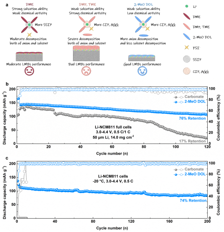(弱溶剂化电解液对锂电池的作用效果示意图及电化学性能测试)