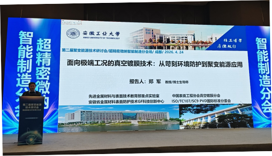 重点实验室郑军教授应邀参会,在超精密微纳智能制造论坛上作了题为“面向极端工况的真空镀膜技术:从苛刻环境防护到聚变能源应用”的邀请报告。报告立足国家聚变能源重大战略需求,系统展示了团队在真空镀膜领域长期深耕的标志性成果,形成了从“基础研究—关键技术攻关—极端工况应用—聚变能源前沿探索”的完整创新链条。郑军教授重点介绍了面向航天、航空、兵器等国家重大工程苛刻服役环境的真空镀膜防护技术,并提出了惯性约束聚变靶丸真空镀膜防护、靶室内壁真空镀膜防护等聚变能源核心应用场景。该研究深度契合聚变能源领域对极端环境材料防护需求,引发与会专家的高度关注与热烈讨论,充分显示了我校在极端工况表面工程领域的科研实力与创新水平。