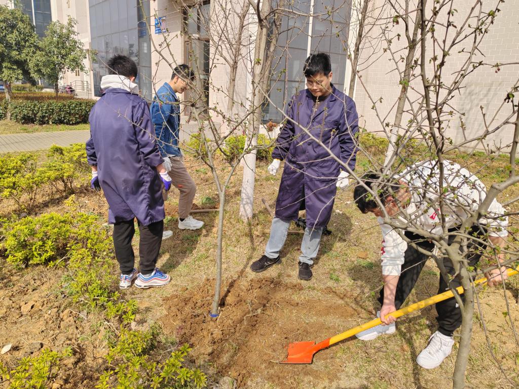 赵颖虹带领学生党员们分工协作、相互配合,挥镐舞锄、扶直树苗、提水浇灌……大家干劲十足,每道工序都做得一丝不苟。唐记明和后勤老师现场传授植树要领,提升苗木的成活率。