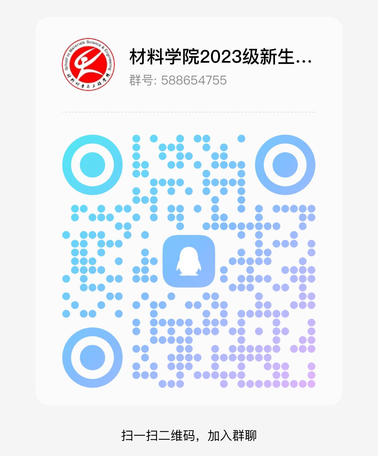 2023级新生QQ群,群号588654755,下方为群二维码,请新生们及时加群,欢迎大家积极询问、交流。