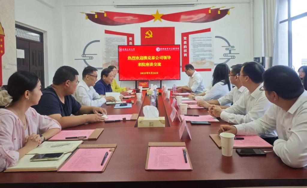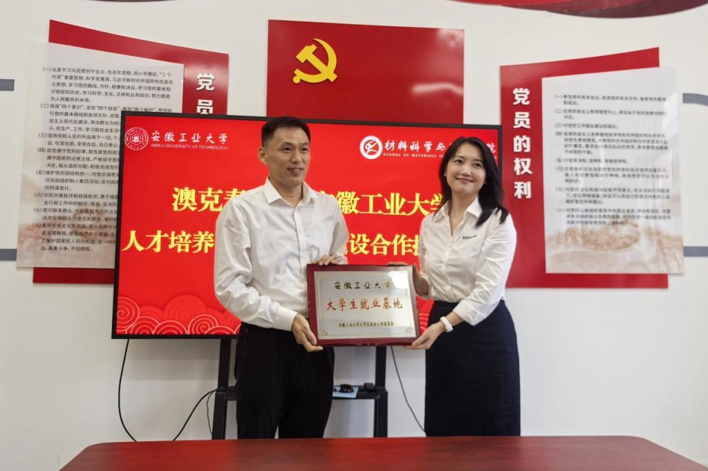 座谈会上,杨建对企业一行表示欢迎,介绍了学院在发展历程、学科建设、科学研究及人才培养等方面的成果,并感谢校友邱联昌对母校发展的关心。汪盛颜通报了学院2025届毕业生升学就业概况。邱联昌详细介绍了澳克泰公司的业务领域、人才需求及发展愿景,并表达了反哺母校、深化合作的意愿。双方就协同育人达成共识,现场签订了人才培养与就业基地建设协议,授予大学生就业基地牌匾,标志着校企合作迈入实质性阶段。